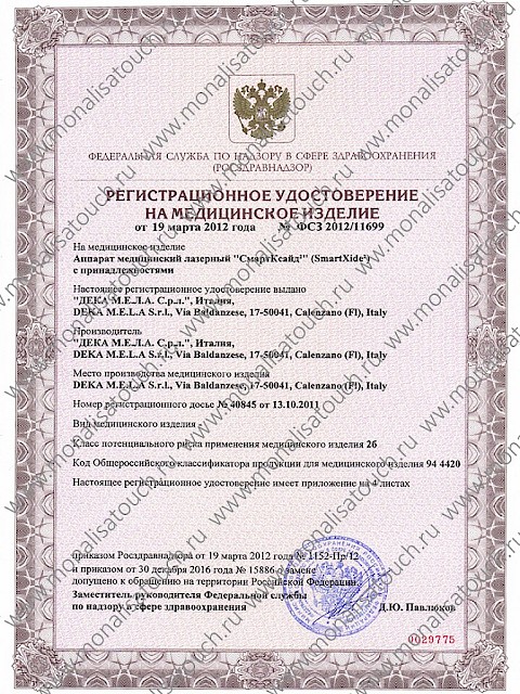 MonaLisa Touch® – новейшая и единственная в мире лазерная методика, разработанная и запатентованная итальянской компанией DEKA для восстановления трофики, лечения и омоложения вульвовагинальной области. Инновационная технология MonaLisa Touch® разработана для лазерных систем SmartXide2 и SmartXide Touch с использованием уникальной технологии интравагинального сканирования HiScan V2LR и особой формы импульса DEKA Pulse (D-Pulse), характеризуется абсолютной точностью и эффективностью воздействия, надежностью и безопасностью.
